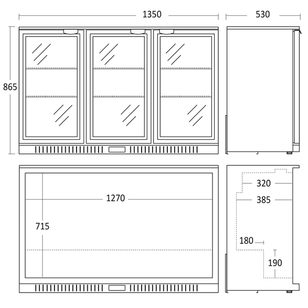 Kabinettet er mindre end 90 cm højt og har højrehængte glasdøre med frontventilation, hvilket gør det særligt velegnet til indbygget installation under diske eller barer. Backbars er også velegnede som minibarer i hotelmiljøer.